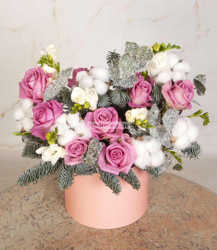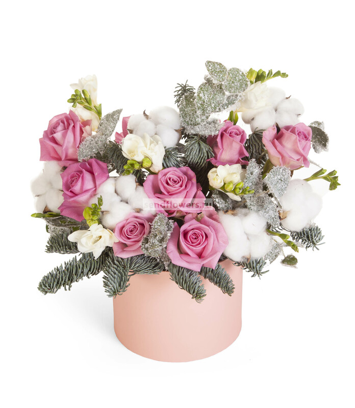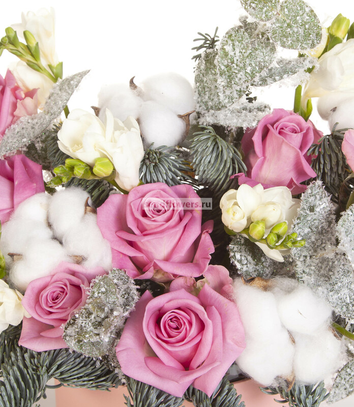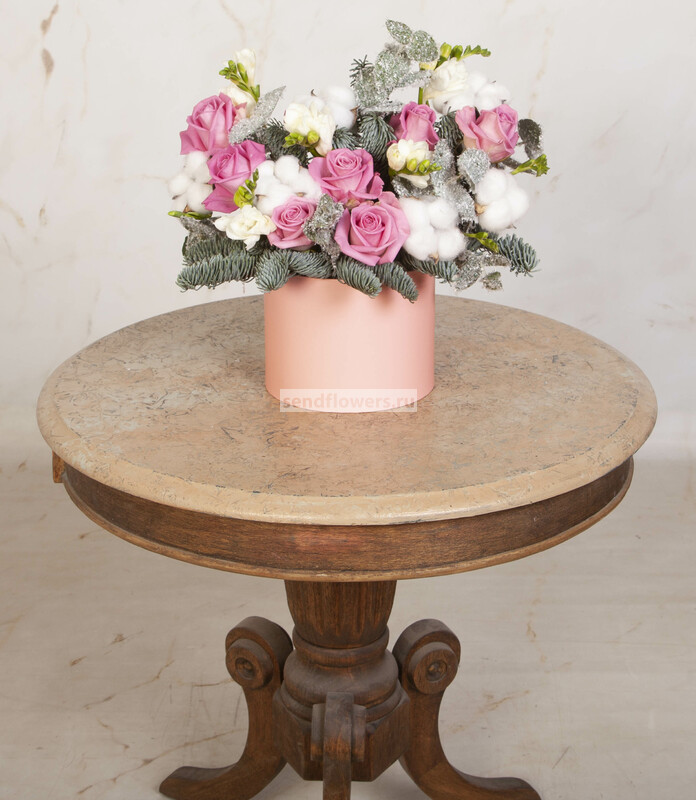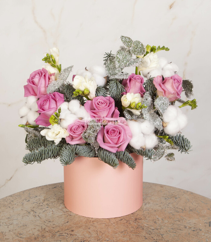 Состав: Эвкалипт (1), Оазис кирпич (2), Лапник (1), Хлопок (6), Снег искусственный (1), Фрезия белая (5), Роза розовая (11), Коробка шляпная малая (цилиндр) (1)