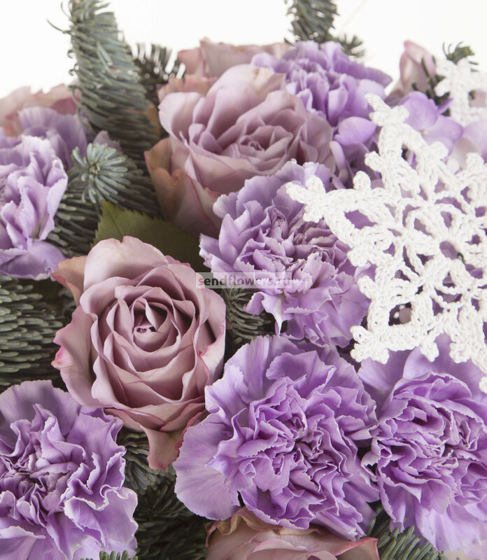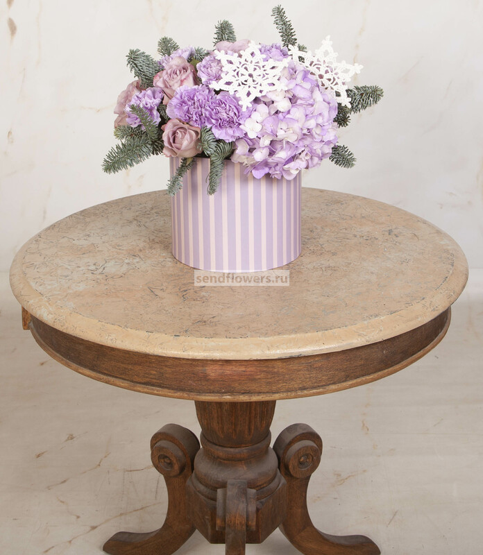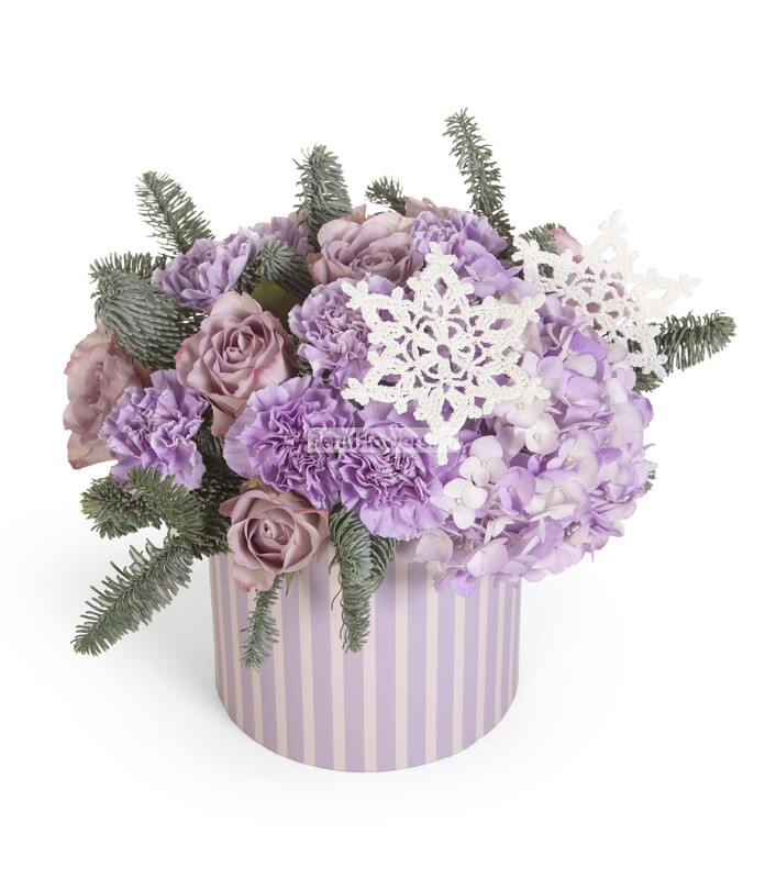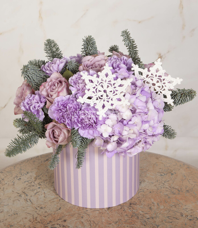 Состав: Оазис кирпич (2), Лапник (1), Гвоздика лиловая (7), Роза "Fifth Avenue" (10), wG-59\2 Коробка подарочная (1), Гортензия лиловая СО (1), Вязаные снежинки (2)