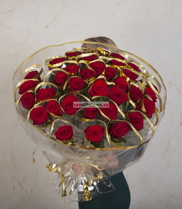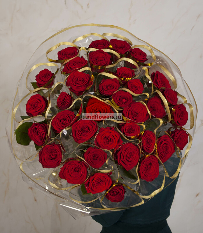 Состав: Лента натуральная (30), Роза Гран При (35), Пленка прозрачная (20)