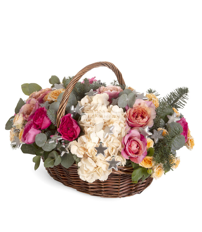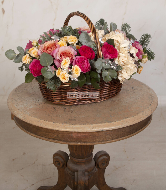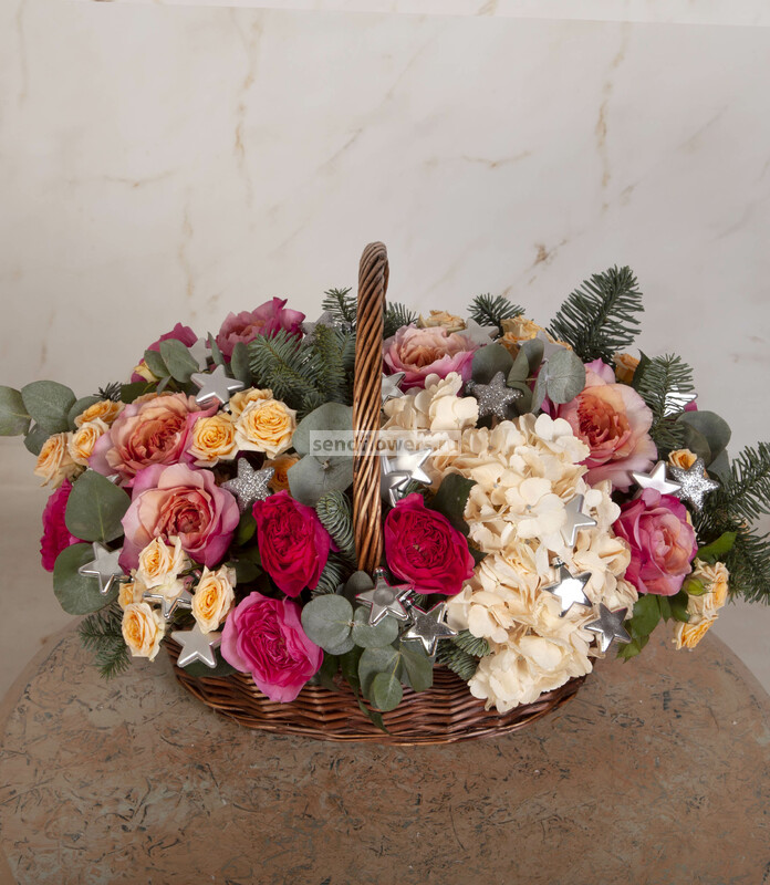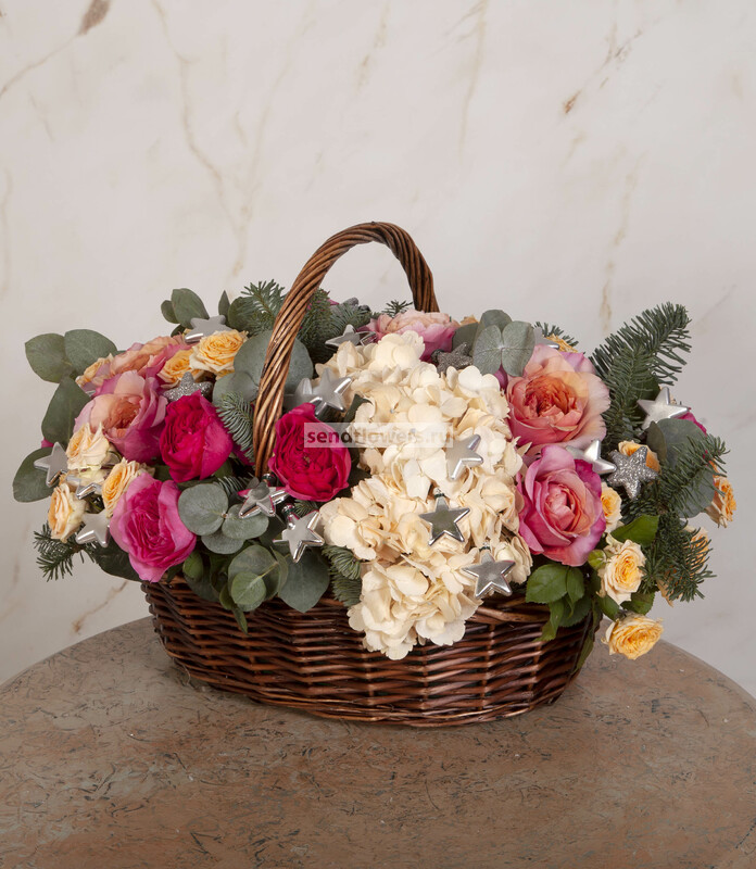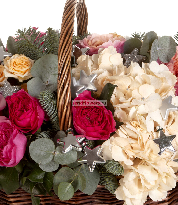 Состав: Эвкалипт (2), Оазис кирпич (2), Корзина малая (1), Лапник (1), Роза кустовая кремовая (10), Звезды, ёлочки декор на вставке (блест.) (15), Роза Baronessa (5), Роза Miyabi (7), Гортензия кремовая СО (1)