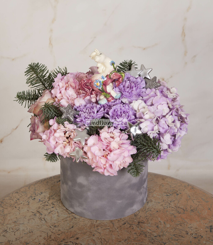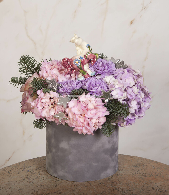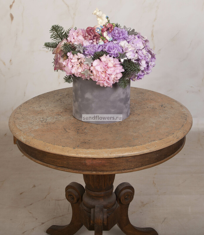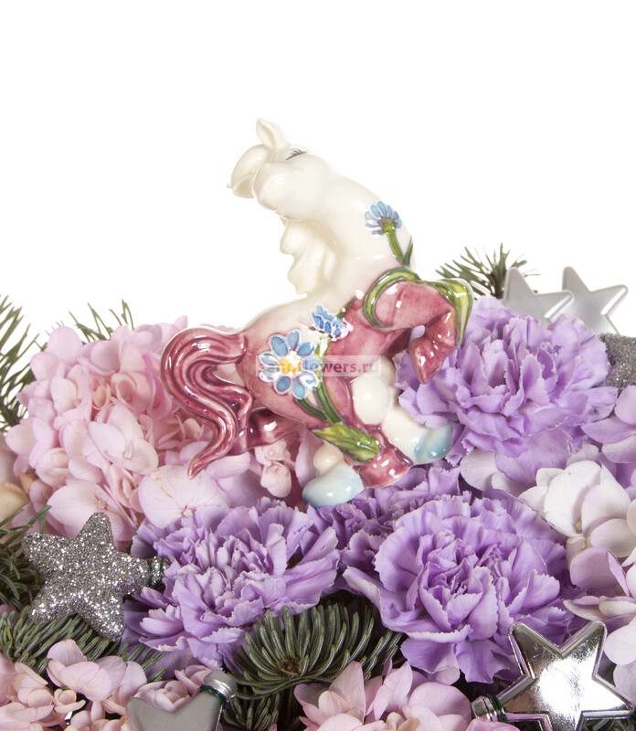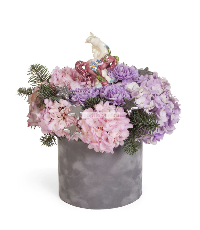 Состав: Оазис кирпич (2), Лапник (1), Лента натуральная (5), Гвоздика лиловая (5), Звезды, ёлочки декор на вставке (блест.) (9), Роза "Fifth Avenue" (5), Коробка бархатная серая (1), Гортензия розовая CO (1), Гортензия лиловая СО (1), jP-61/61 Фигурка 'Лошадка Ромашка' (Pavone) (1)